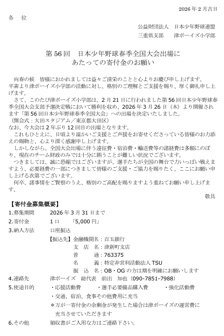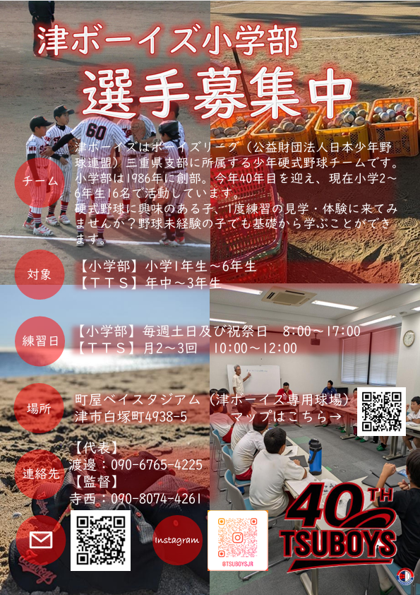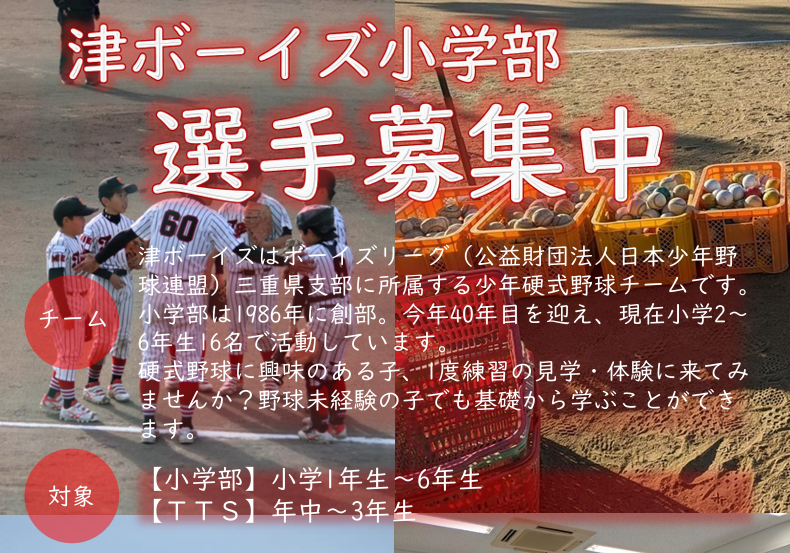 津ボーイズはボーイズリーグ(公益財団法人日本少年野球連盟)三重県支部に所属する少年硬式野球チームです。