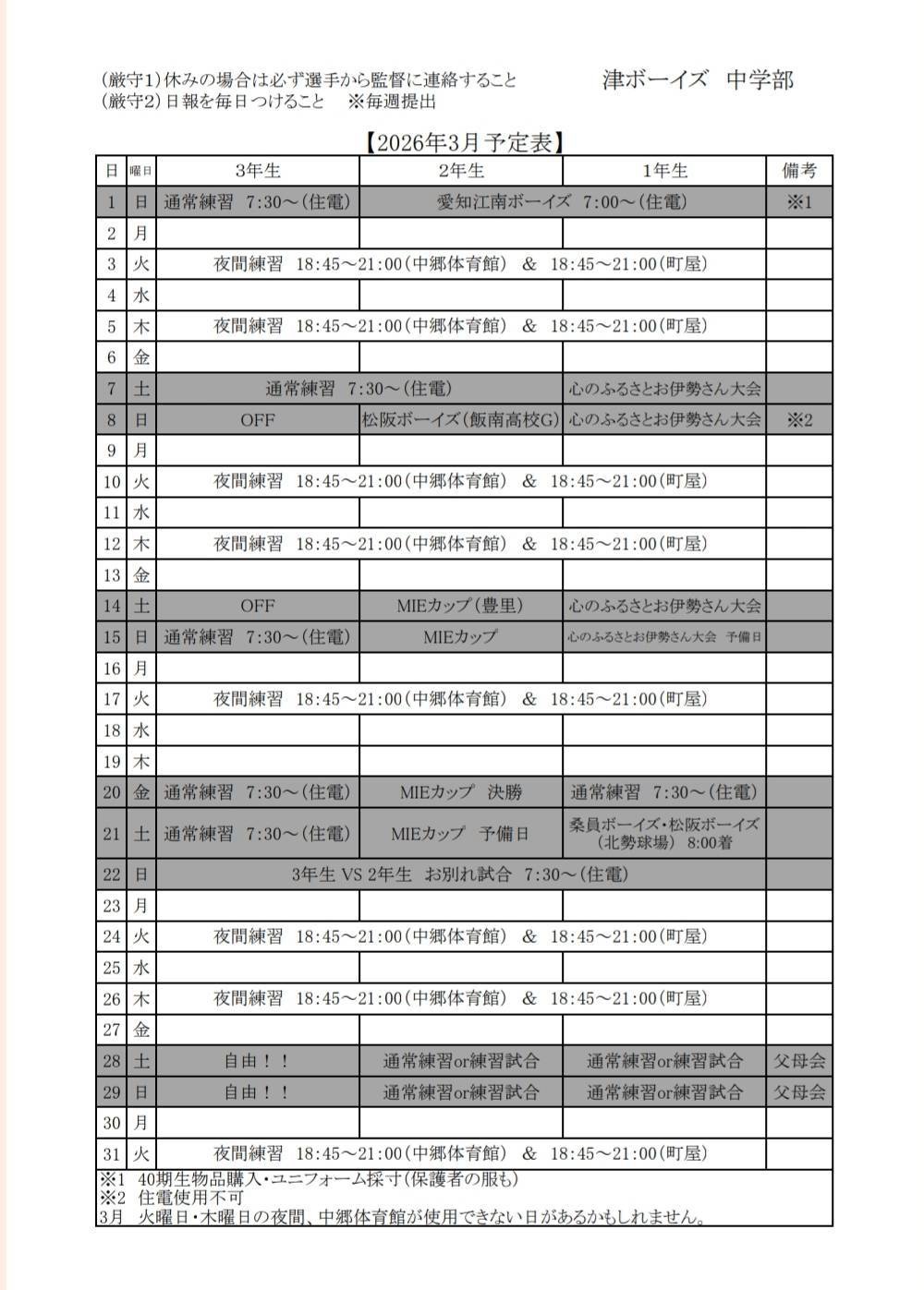 中学部 年間スケジュール